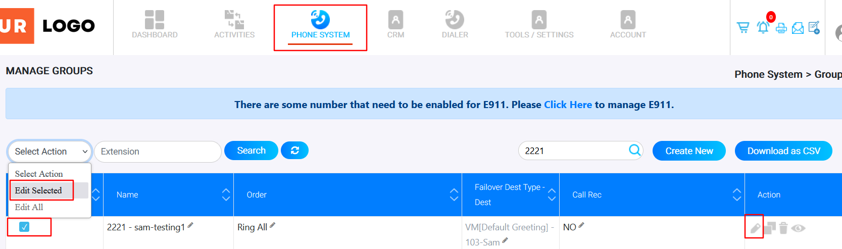 2. Select the group(s) for which you want to enable call recording and click **Edit Selected**.<br>