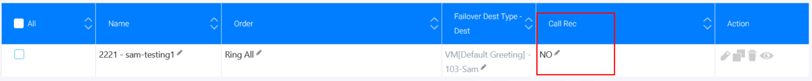 Alternatively, you can enable call recording for a single group by setting the value under the **Call Rec** column to **Yes** in the group list.
