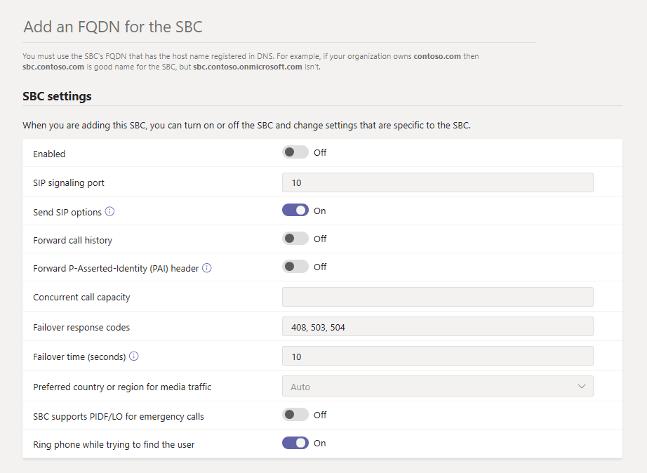 Make sure the domain name portion of the FQDN matches a domain that's registered in your tenant, and keep in mind that the *.onmicrosoft.com domain name isn't supported for the SBC FQDN domain name. For example, if you have two domain names, contoso.com and contoso.onmicrosoft.com, use sbc.contoso.com as the SBC name.