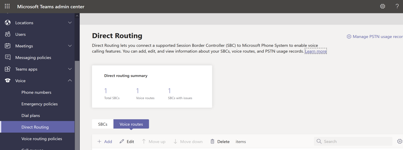 In the left navigation of the Microsoft Teams admin centre, go to Voice > Direct Routing, and then select the Voice routes tab.