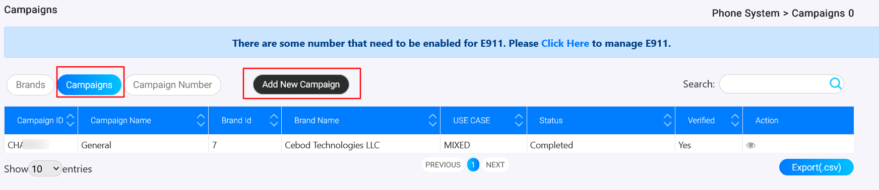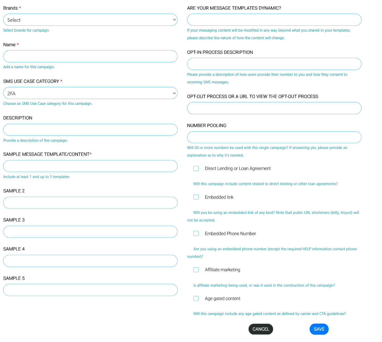 The **Create New Campaign** form allows you to set up and register a new messaging campaign under an existing brand. Each campaign requires detailed information to comply with carrier and SMS regulations. After filling up all the information, press the **"Save"** button for further processing.